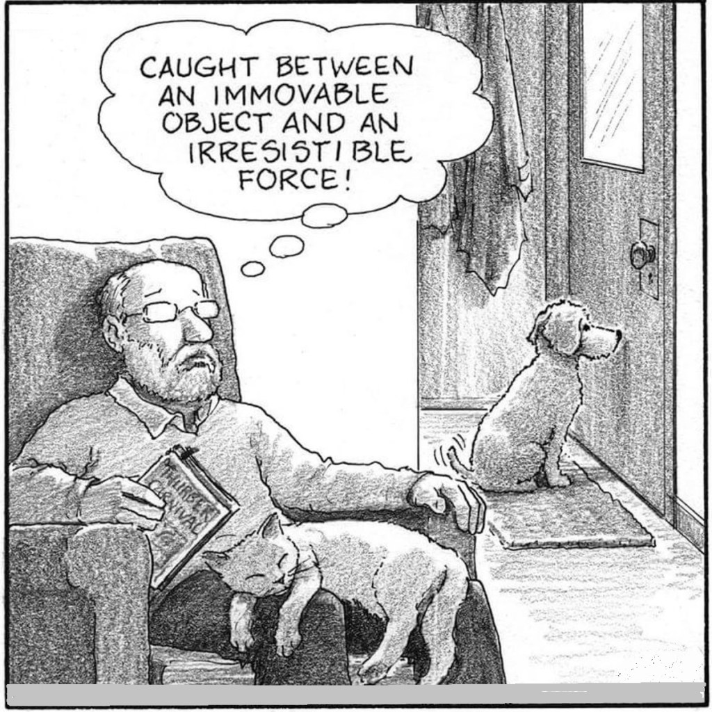 7:30am: Invaders! The people who live next door came out into their yard, obviously getting ready to lay siege to our house. Snarling and barking, I let them know in no uncertain terms that I was prepared to tear them from limb to limb if they came any closer, and was able to repel the invasion. This is an almost daily occurrence; you’d think they’d learn. My master added his voice to the fray as well, yelling angrily. I am sure the people couldn’t hear him, but it was nice of him to lend his support.