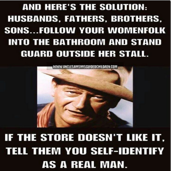 Once again, for the good of our society and country, I have wrestled with a liberal created bullshit issue designed to undermine our values and come up with a simple solution. All I really needed to do was ask myself ‘WWTDD?’, (What Would The Duke Do?) after that the answer was perfectly simple and clear to me-