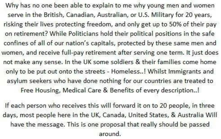 I would make one point though, this issue isn’t one being raised by Vets, it’s being raised by the people. The fact that Vets simply take this stoically in stride is another testament to their love of this country and what it stands for, despite the never ending screwing they get post service by those 100% retirement politicians who make such noises about ‘American Heroes’.