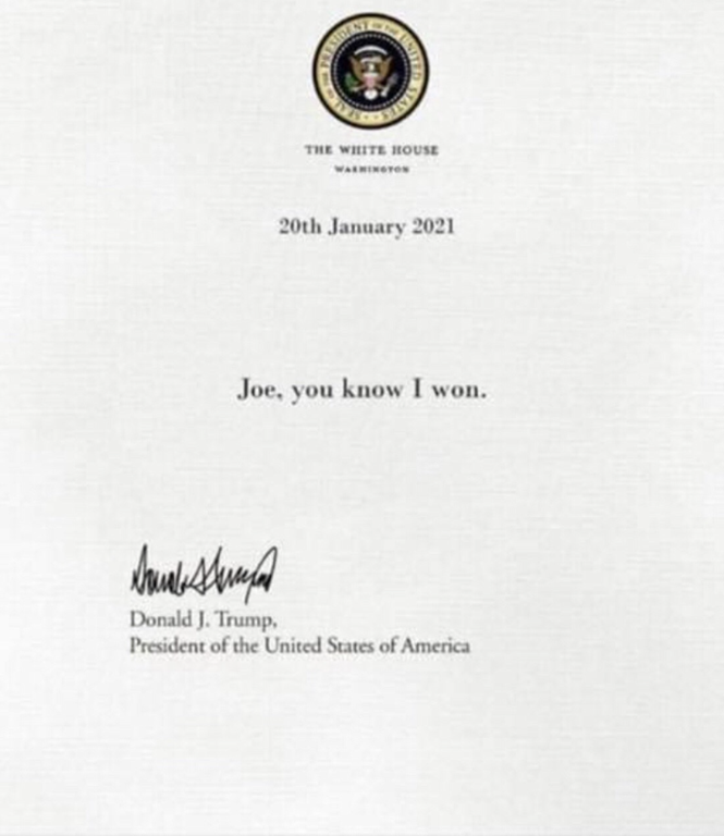 We found out recently that President Trump left a letter for Biden, a long tradition between presidents.  Dragon Laffs have exclusively received a copy of the letter and we’re going to share it with you, are faithful campers: