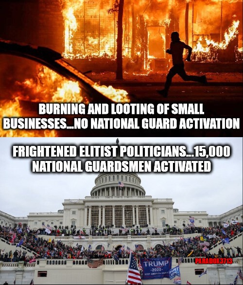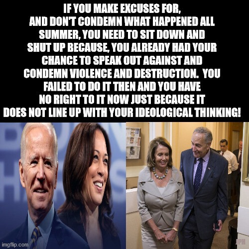 I do not condone the breaching of the Capitol Building by any means.  It was wrong on many levels.  BUT!!  I you did NOT condemn, AND in fact condoned and encouraged the BLM and ANTIFA Riots, Murders, Lootings, and Destruction of American Cities and Business Owners, AND backed the dropping of charges and release of those responsible for those crimes – YOU ARE THE PROBLEM!!