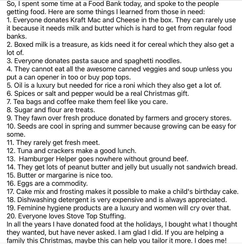Feminine hygiene products, socks, can openers, powdered milk, things that can be made by adding water only, things that can just be warmed up.