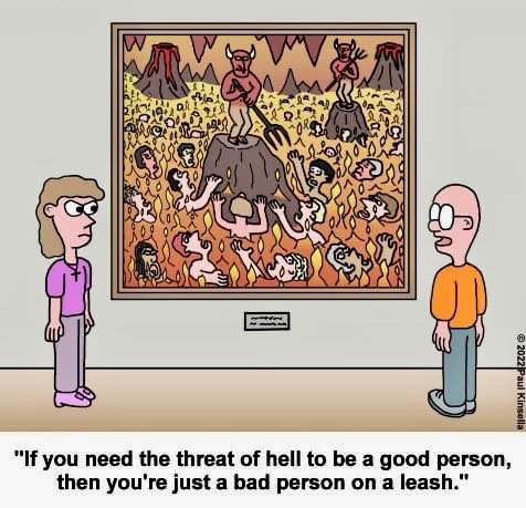 I specifically moved this one to the top of the queue so that I could talk about it because it is SO TRUE!  Everyone has an internal voice inside of them that tells them right from wrong.  You KNOW when you are doing something that’s wrong or cruel or hurtful or whatever and if you do it anyway, you can justify it anyway you want, you are still wrong.  Just like Joe Biden and the giving away of America.  He’s doing it to win votes and keep the democrats in power.  That’s his justification, but inside, he has to KNOW that what he’s doing is WRONG.  He promised to forgive all the student loans, even though he KNEW that it was illegal.  But, that wasn’t brought out until after the mid-terms and all the young people who thought they were getting all that money voted for the left, even though the intelligent thinking person KNEW it was a bad, evil, wrong thing.  Now that a judge is saying that he can’t do it, it’s “Gee, I’m sorry, I tried” and all the young people were hoodwinked.  Biden KNEW what he was doing was wrong, but did it anyway.  That is NOT the kind of people we want running our country.  What was once thought to be the greatest country on the face of the earth.  “If you need the threat of Hell to be a good person, then you are just an evil person on a leash.”