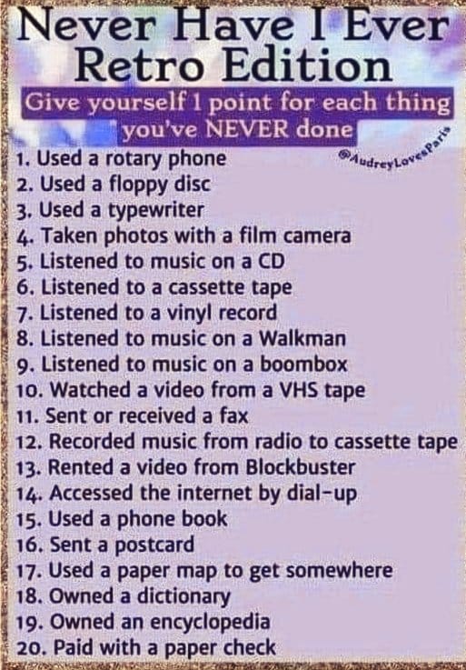 Okay, remember the rules…give yourself one point for every item on the list that you have NOT done. So, out of the twenty items on the list, Impish Dragon gets a score of ….. zero. I’ve done every single one of those things. Come on! That stuff wasn’t THAT long ago, was it?