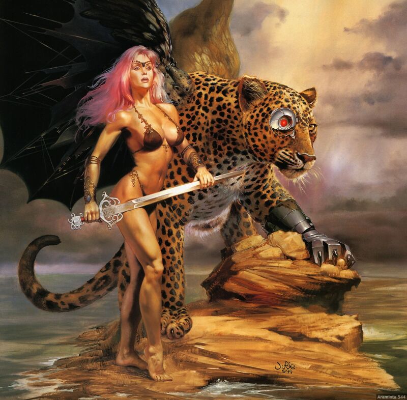 Her: Well, behind them two, on the left hand side of the screen, there’s a woman gladiator holding a spear.