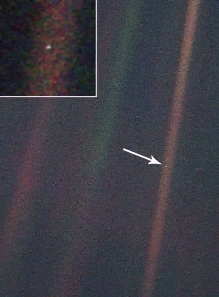 Photo of planet Earth (Pale Blue Dot) captured by Voyager 1 at a record distance of 5.9 billion km. (the radio signal took 5.5 hours to reach Earth), showing it against the background of space. This is absolutely mindblowing image of our home planet. Learn more about this image from here