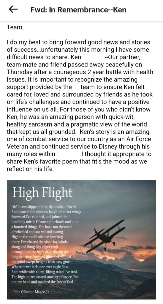 So, now I’m sitting here, 1,043 miles away trying to help as best I can, while not trying to overstep my bounds and staying in my own lane and keep everyone’s … his true best friend, his former wife (who still loves him very much), all his other best friends, all the people he worked with (I’ll show you that in a minute), what’s left of his family, but most of all and most importantly of all Ken himself …wishes and desires for Ken’s final send off.
