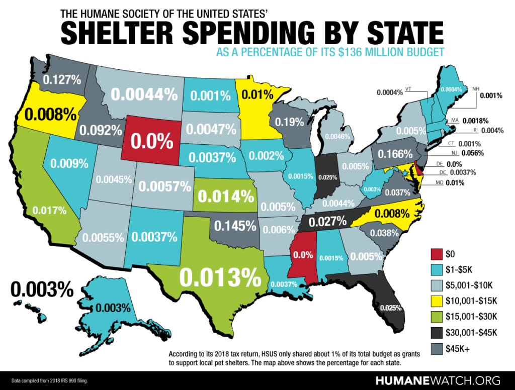 How little of the money raised by HSUS goes to pet shelters in your state? The map below, which was made using data from HSUS’s tax return to determine the amount of grant money going to help local shelters care for pets. And if you’re wondering where the money does go, here’s a start: Over $100 million in Caribbean “investments,” a multimillion-dollar bribery lawsuit settlement, and a big fat paycheck for CEO Wayne Pacelle.
