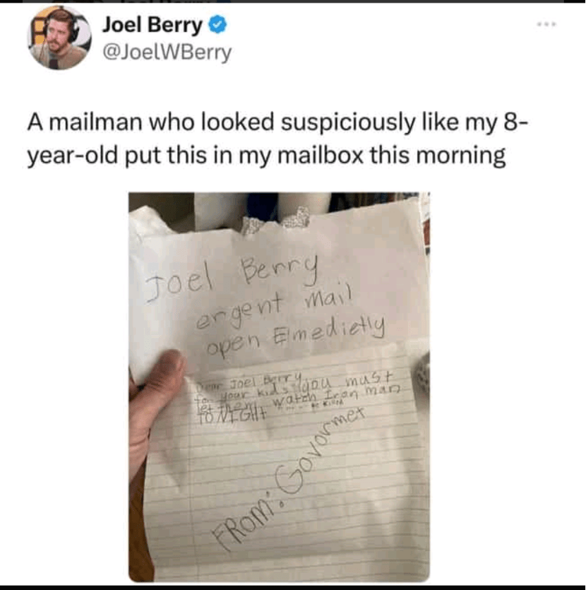Our scoutmaster told us to write to our parents in case you saw the flood on TV and were worried. We are OK. Only one of our tents and two sleeping bags got washed away. Luckily, none of us got drowned because we were all up the mountain looking for Chad when it happened. Oh yes, please call Chad’s mother and tell her he is OK. He can’t write because of the cast.