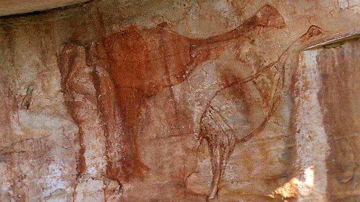 A 40,000-year-old rock painting in Australia, likely one of the oldest and believed to be depicting the large flightless bird, the Genyornis