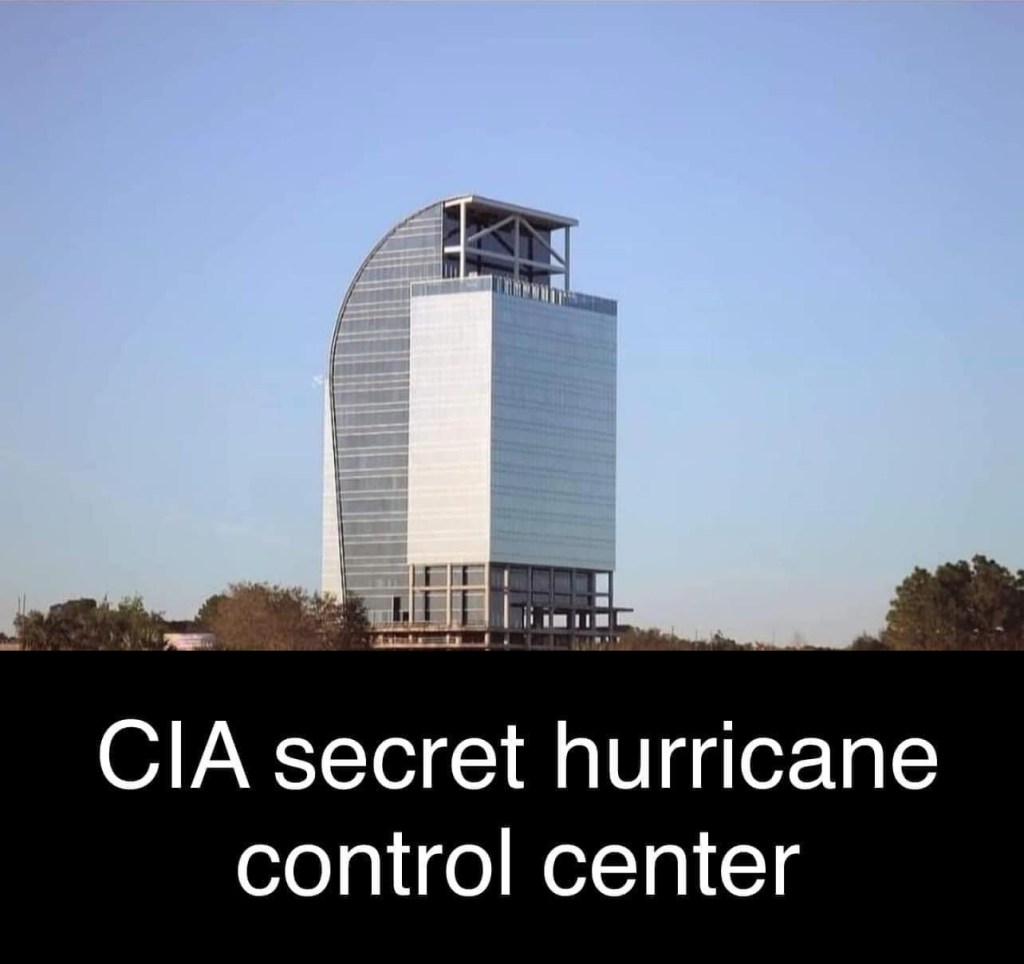 That’s the latest “conspiracy theory”. That the government, either through trying to control the weather in an effort to help global warming (or global cooling, or whatever it is THIS year) or in an effort to actually create hurricanes to draw our attention away from the cataclysmic mess they are making of things currently OR to create an emergency so huge that they have to declare martial law and cancel all the elections so Trump can’t get in office or some other asinine theory, that they are controlling or creating the weather on purpose.