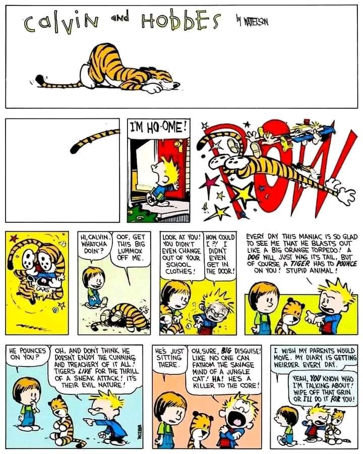 Calvin then turned to face his oldest and dearest friend. “Hello Hobbes. It’s been a long time hasn’t it old pal?”