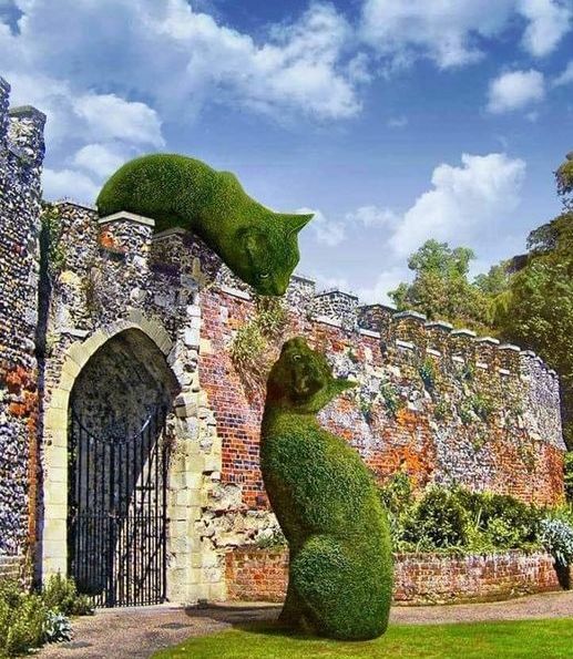 Okay, I did an image search and spent the last 30 minutes investigating this image. This guy DOES have topiary cats (not these two) and a whole … thing going on. Books for kids and what not based on his two cats. Quite interesting.